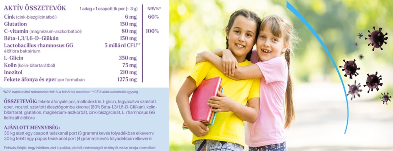 Az immunvédő hatás fokozása érdekében terméket béta-glükánokkal bővítettük! A béta glükánok hatékony immunstimulánsok, immunrendszerünket aktiválják, a termék hatékonyságát fokozzák. 5 millárd Lactobacillus Rhamnosus GG baktérium tartalommal. Az élőflóra törzs egyszerre támogatja a gyerekek immunitását és egészséges bélműködését (hasfájás, székrekedés, lassú emésztés, puffadás, gázképződés ellen). A kolin és inozitol a gyerekek májműködését támogatja, a helytelen táplálkozási szokásokat (megnövekedett cukorfogyasztás) ellensúlyozza. Idegrendszervédő (nyugtató, koncentrációs képességet fokozó) hatást is kifejtenek.